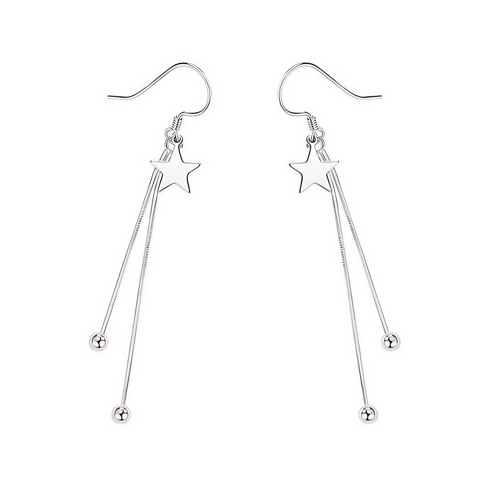 Playful elegance meets modern design in the Stella Earrings. Crafted from 925 sterling silver with a radiant rhodium-plated finish, these earrings feature delicate silhouettes highlighted by star-shaped charms and slender bars ending in polished spheres. Lightweight, they create a dynamic, sophisticated look perfect for adding a touch of whimsy and elegance to any occasion.