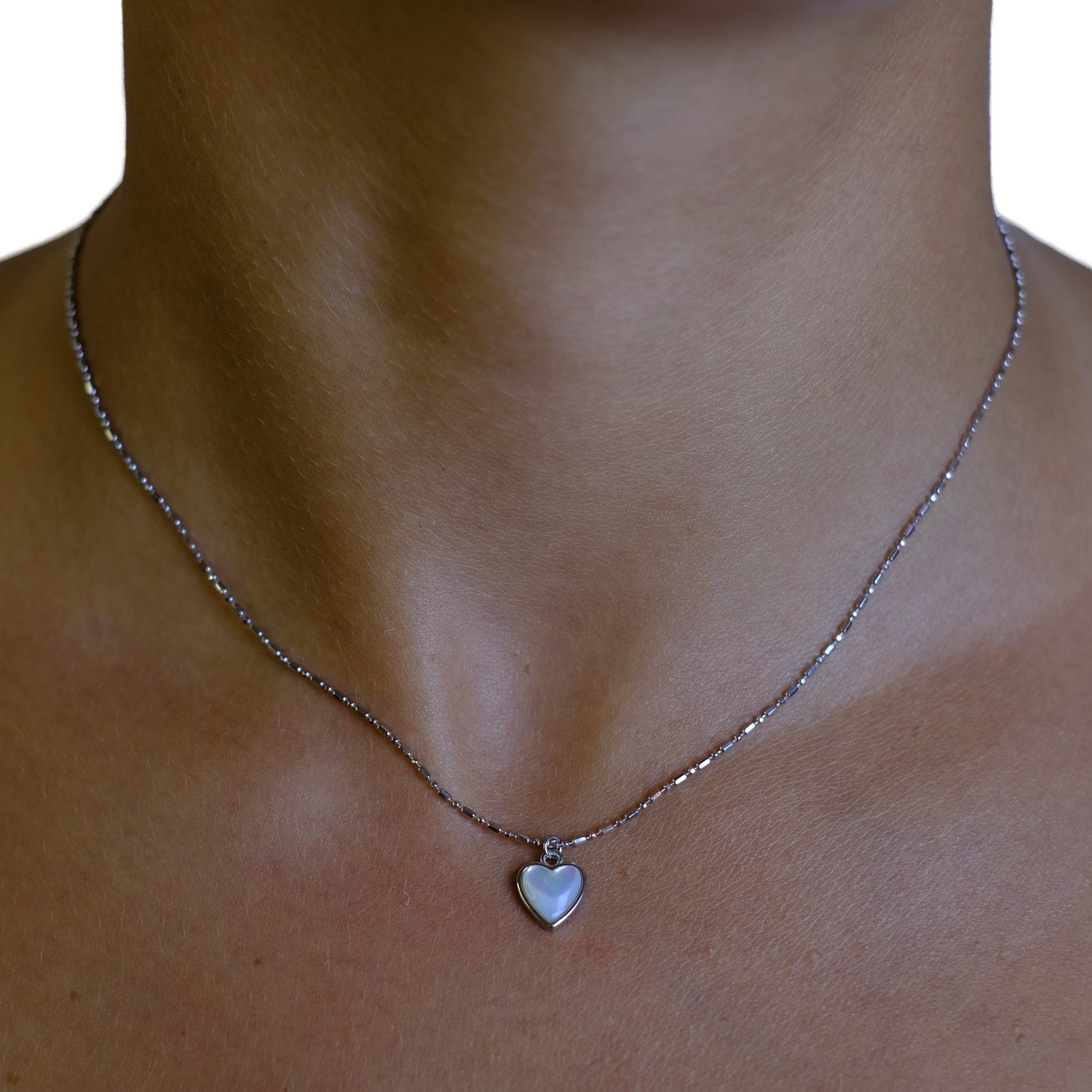 Expertly crafted with 925 sterling silver and adorned with a heart-shaped shell pendant, the Tasha Necklace brings a touch of romance to minimalist elegance. The platinum-plated finish enhances its brilliance, while the finely detailed chain adds a hint of texture and sophistication.